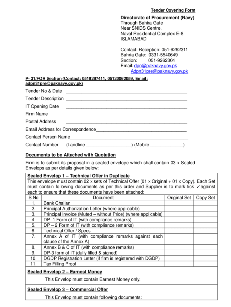 Tender Covering FormDirectorate of Procurement (Navy) Through Bahia Gate Near SIDS Center, Naval Residential Complex E8 ISLAMABAD Contact: Reception: 0519262311 Bahia Gate: 03315540649 Section: 0519262304