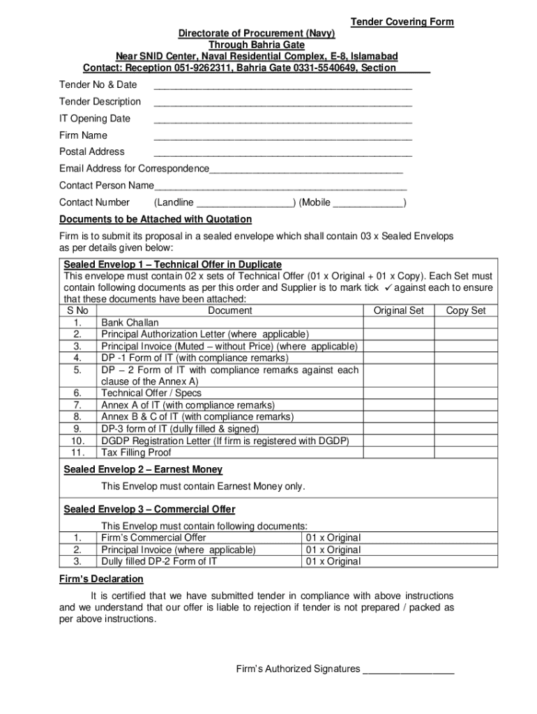 Tender Covering Form Directorate of Procurement (Navy) Through Bahia Gate Near SAID Center, Naval Residential Complex, E8, Islamabad Contact: Reception 0519262311, Bahia Gate 03315540649, Section