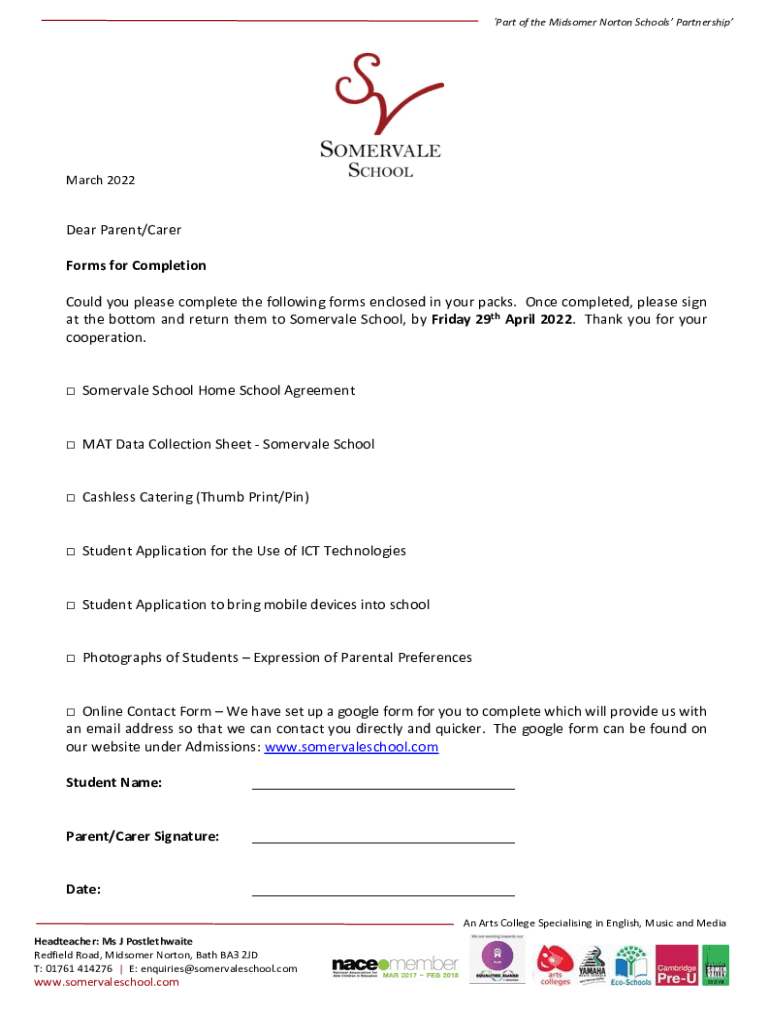 Part of the Isomer Norton Schools Partnership March 2022Dear Parent/Carer Forms for Completion Could you please complete the following forms enclosed in your packs. Once completed, please sign at