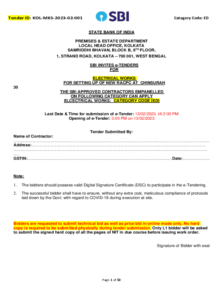 Tender ID: KOLMKS202302001Category Code: ESTATE BANK OF INDIA PREMISES & ESTATE DEPARTMENT LOCAL HEAD OFFICE, KOLKATA PARIDHI HAVEN, BLOCK B, 9TH FLOOR, 1, STRAND ROAD, KOLKATA 700 001, WEST BENGAL