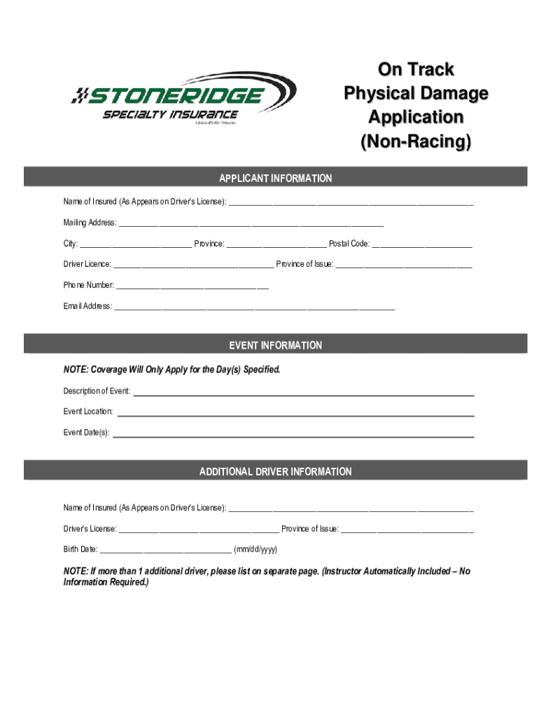 On Track Physical Damage Application (Nonpaying) APPLICANT INFORMATION Name of Insured (As Appears on Driver's License): ___ Mailing Address: ___ City: ___ Province: ___ Postal Code: ___ Driver License: