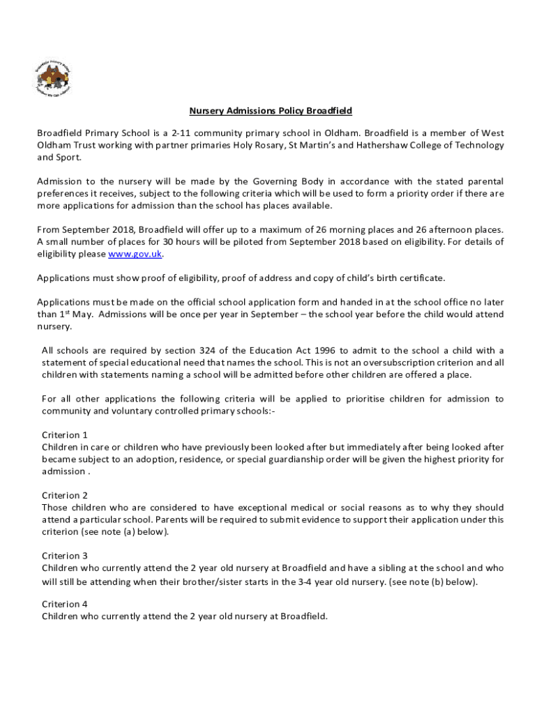 Get the free Nursery Admissions Policy - Oldham - Broadfield Primary School