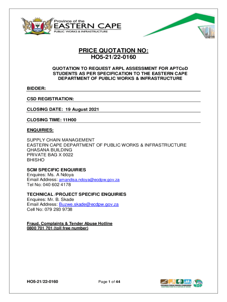 PRICE QUOTATION NO: HO521/220160 QUOTATION TO REQUEST ARL ASSESSMENT FOR Action STUDENTS AS PER SPECIFICATION TO THE EASTERN CAPE DEPARTMENT OF PUBLIC WORKS & INFRASTRUCTURE BIDDER: CSD REGISTRATION: