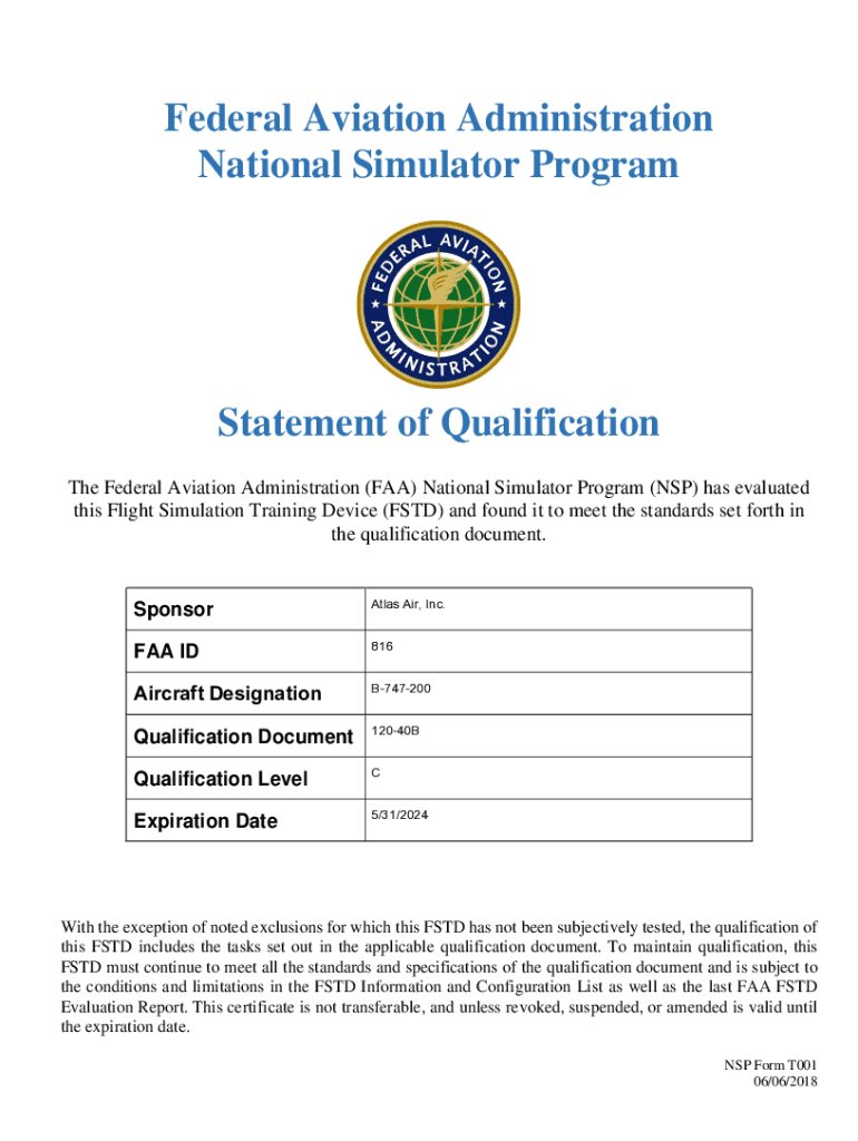 Federal Aviation Administration National Simulator ProgramStatement of Qualification The Federal Aviation Administration (FAA) National Simulator Program (NSW) has evaluated this Flight Simulation