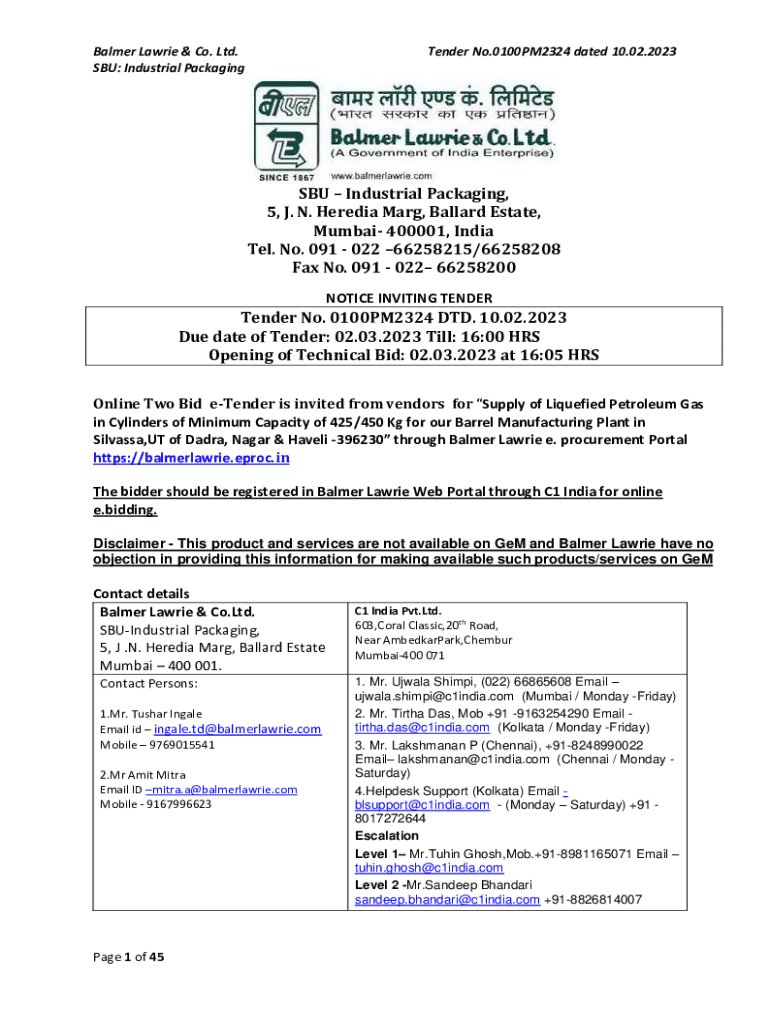 Palmer Laurie & Co. Ltd. SBS: Industrial PackagingTender No.0100PM2324 dated 10.02.2023SBU Industrial Packaging, 5, J. N. Hardin Mary, Ballard Estate, Mumbai 400001, India Tel. No. 091 022 66258215/66258208
