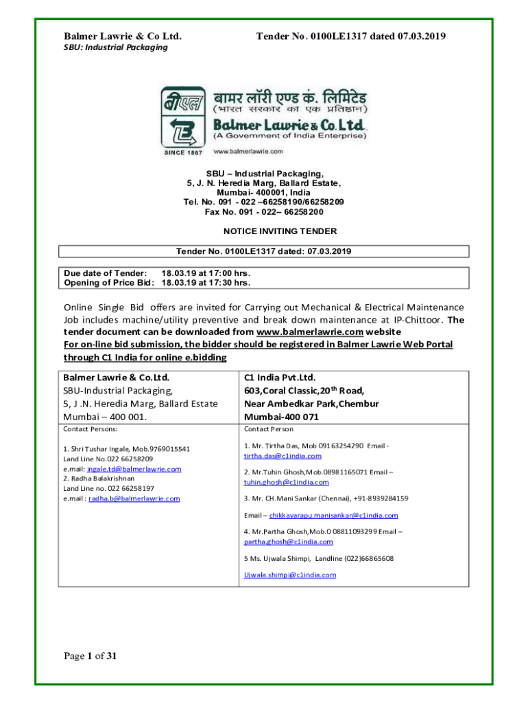 Palmer Laurie & Co Ltd. Tender No. 0100LE1317 dated 07.03.2019SBU: Industrial Packaging, 5, J. N. Hardin Mary, Ballard Estate, Mumbai 400001, India Tel. No. 091 022 66258190/66258209 Fax No. 091 022