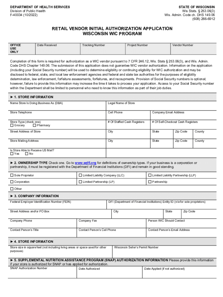 DEPARTMENT OF HEALTH SERVICES Division of Public Health F40034 (10/2022)STATE OF WISCONSIN Wis Stats. 253.06(3) Wis. Admin. Code ch. DHS 149.06 (608) 2666912RETAIL VENDOR INITIAL AUTHORIZATION APPLICATION