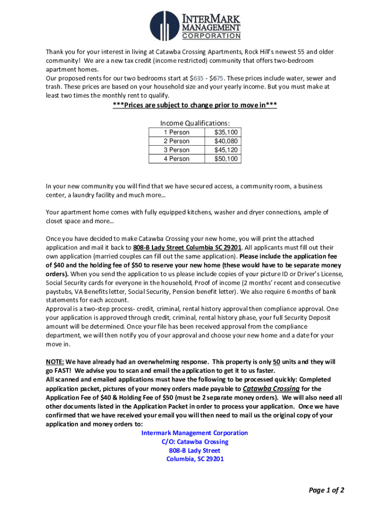 Thank you for your interest in living at Catawba Crossing Apartments, Rock Hills newest 55 and older community! We are a new tax credit (income restricted) community that offers two-bedroom apartment