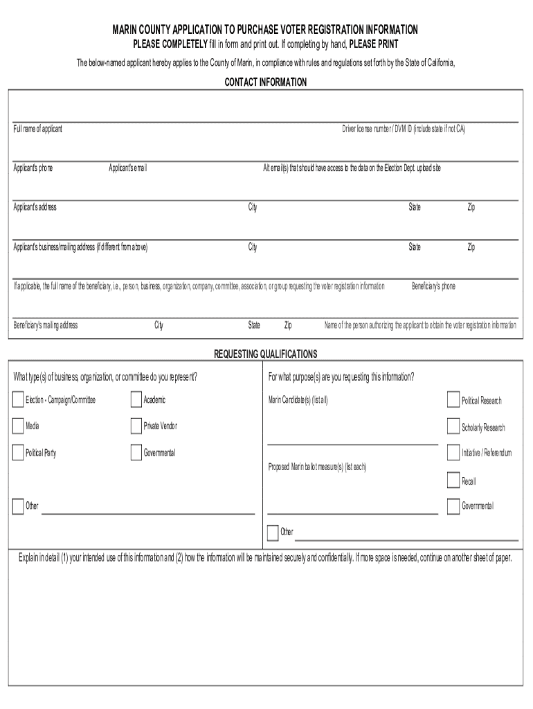 Get the free MARIN COUNTY APPLICATION TO PURCHASE VOTER ...