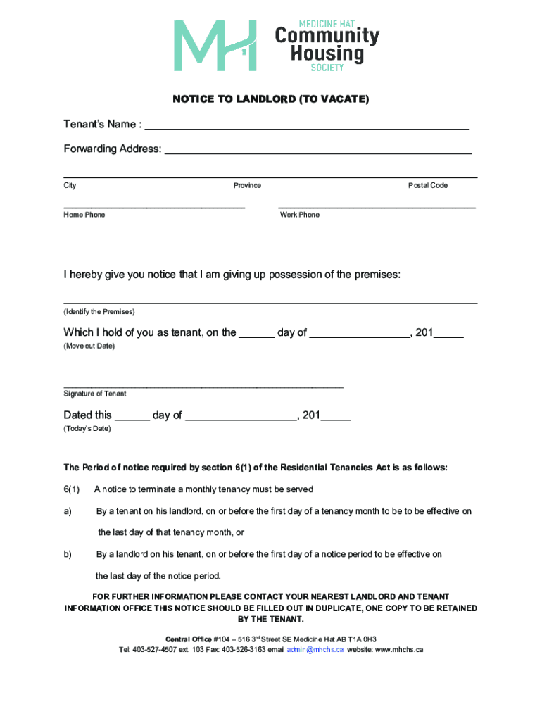 NOTICE TO LANDLORD (TO VACATE)Tenants Name : ___ Forwarding Address: ___ ___ CityProvince___ Home PhonePostal Code ___ Work Phone hereby give you notice that I am giving up possession of the premises: