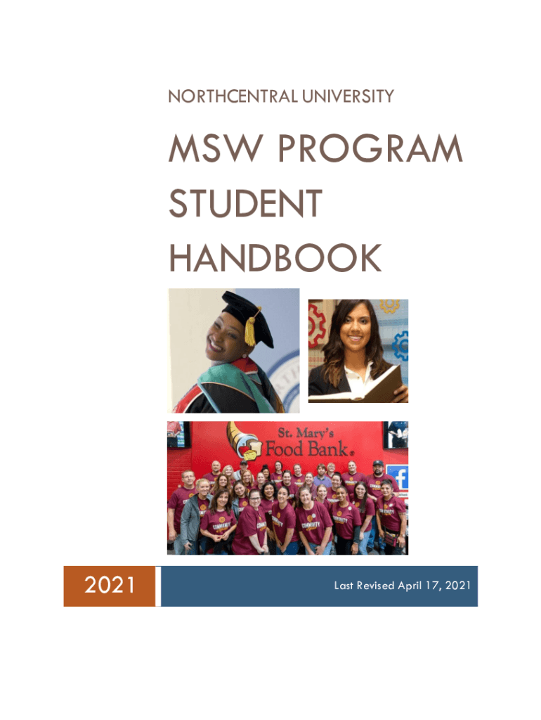 NORTHCENTRAL UNIVERSITY MSW PROGRAM STUDENT HANDBOOK2021Last Revised April 17, 2021This handbook is neither a contract nor an offer of a contract. The material contained herein is not intended to