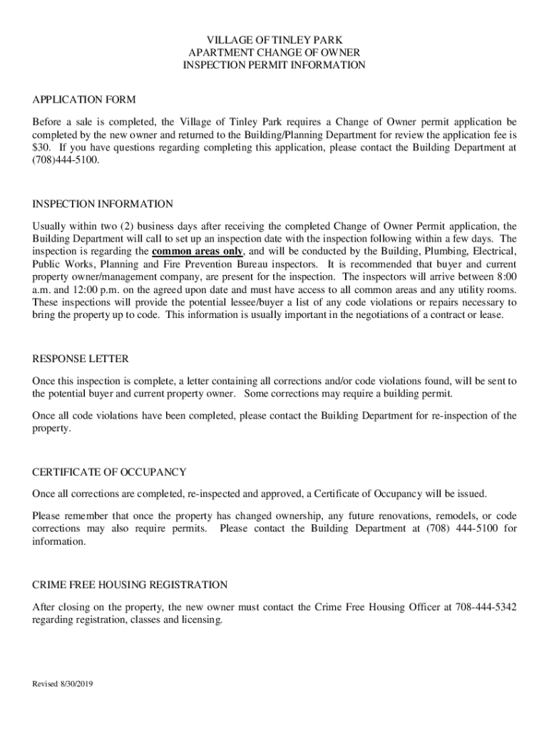 VILLAGE OF TINLEY PARK APARTMENT CHANGE OF OWNER INSPECTION PERMIT INFORMATION APPLICATION FORM Before a sale is completed, the Village of Tinley Park requires a Change of Owner permit application
