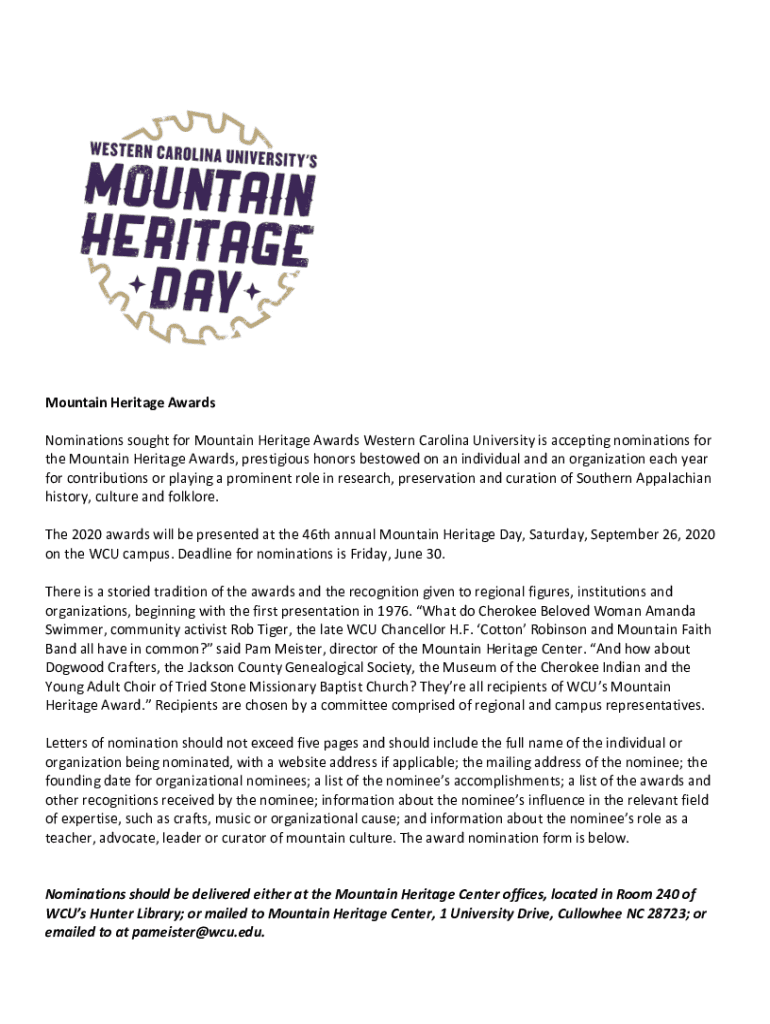 Mountain Heritage Awards Nominations sought for Mountain Heritage Awards Western Carolina University is accepting nominations for the Mountain Heritage Awards, prestigious honors bestowed on an individual