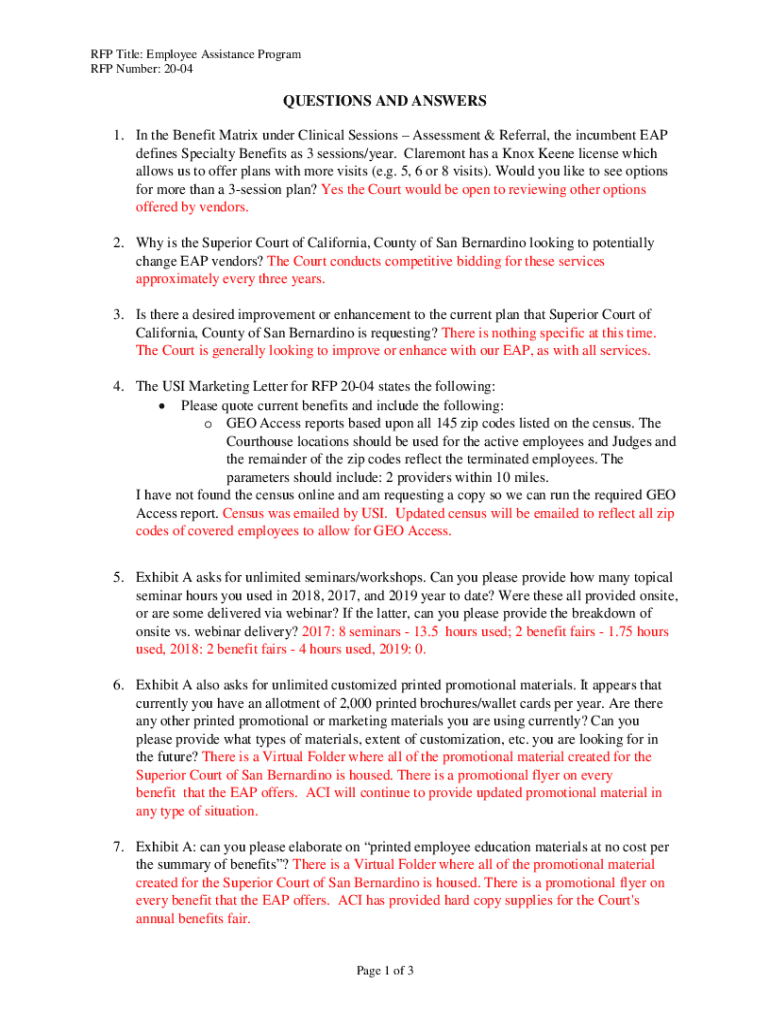 RFP Title: Employee Assistance Program RFP Number: 2004QUESTIONS AND ANSWERS 1. In the Benefit Matrix under Clinical Sessions Assessment & Referral, the incumbent EAP defines Specialty Benefits as