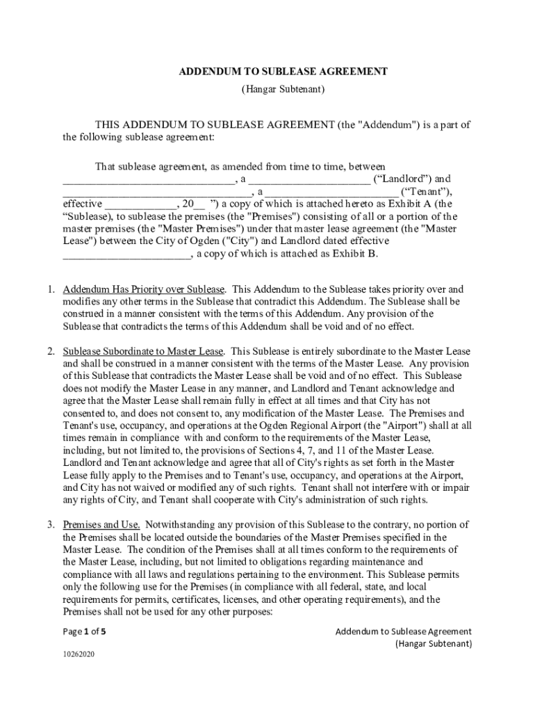 The addendum to a hangar lease must include details of the specific changes or additions to the original lease terms, as well as the signatures of both the landlord and tenant.