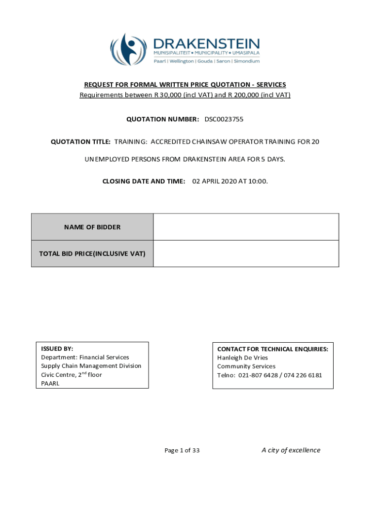 REQUEST FOR FORMAL WRITTEN PRICE QUOTATION SERVICES Requirements between R 30,000 (incl VAT) and R 200,000 (incl VAT) QUOTATION NUMBER: DSC0023755 QUOTATION TITLE: TRAINING: ACCREDITED CHAINSAW OPERATOR