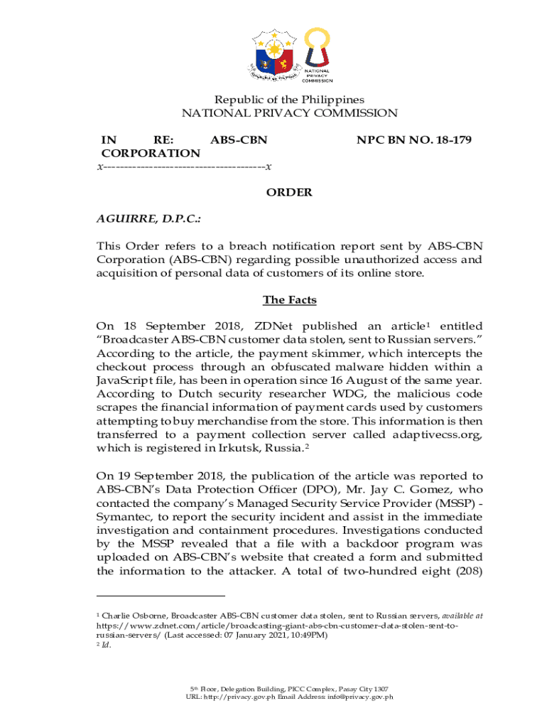 Republic of the Philippines NATIONAL PRIVACY COMMISSION IN RE: ABS CBN CORPORATION xx NPC IN NO. 18179ORDER AGUIRRE, D.P.C.: This Order refers to a breach notification report sent by ABS CBN Corporation
