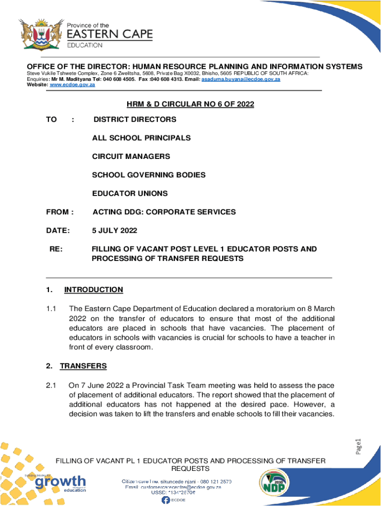 OFFICE OF THE DIRECTOR: HUMAN RESOURCE PLANNING AND INFORMATION SYSTEMS Steve Futile There Complex, Zone 6 Elisha, 5608, Private Bag X0032, Bishop, 5605 Republics OF SOUTH AFRICA: Inquiries: Mr M.
