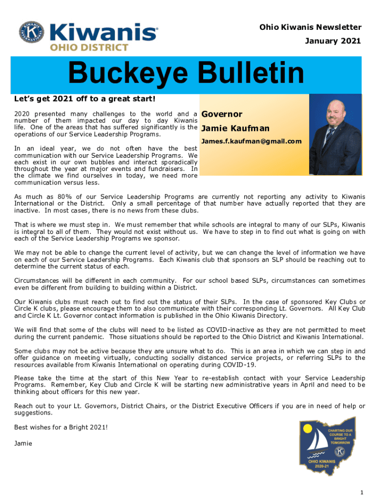 Ohio Kiwanis Newsletter January 2021Buckeye Bulletin Lets get 2021 off to a great start! 2020 presented many challenges to the world and a number of them impacted our day to day Kiwanis life. One