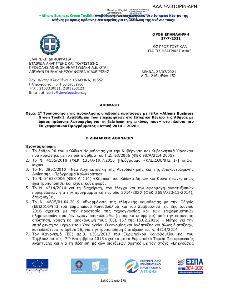 Signed by Ministry of Digital Digitally of Digital Governance, Hellenic Republic Governance, Date: 2021.07.30 13:19:22 Hellenic Republic BEST: 31Athens Business Green Toolkit: Reason: Location: Athens