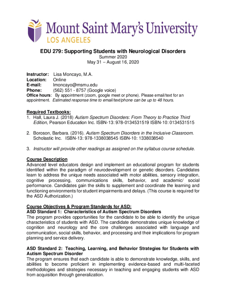 EDU 279: Supporting Students with Neurological Disorders Summer 2020 May 31 August 16, 2020, Instructor: Location: Email: Phone:Lisa Monday, M.A. Online lmoncayo@msmu.edu (562) 551 8757 (Google voice)Office