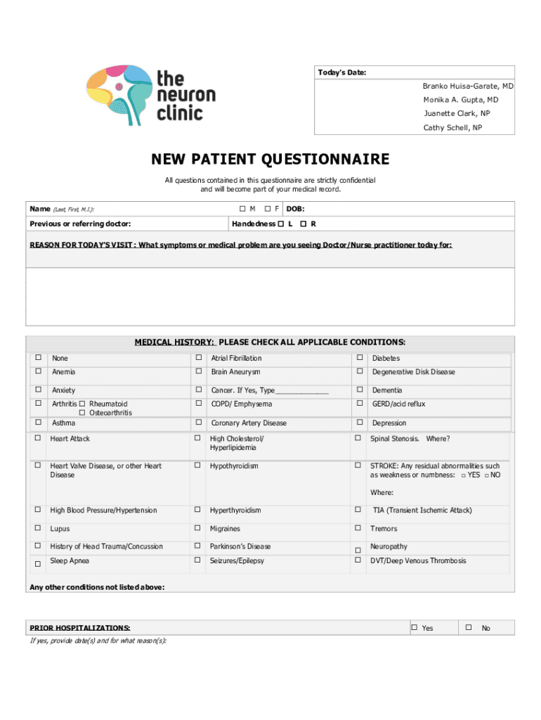 Get the free NEW PATIENT QUESTIONNAIRE - The Neuron Clinic