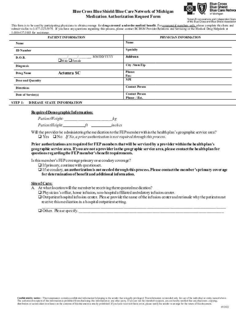 Blue Cross Blue Shield/Blue Care Network of Michigan Medication Authorization Request Form This form is to be used by participating physicians to obtain coverage for drugs covered under the medical
