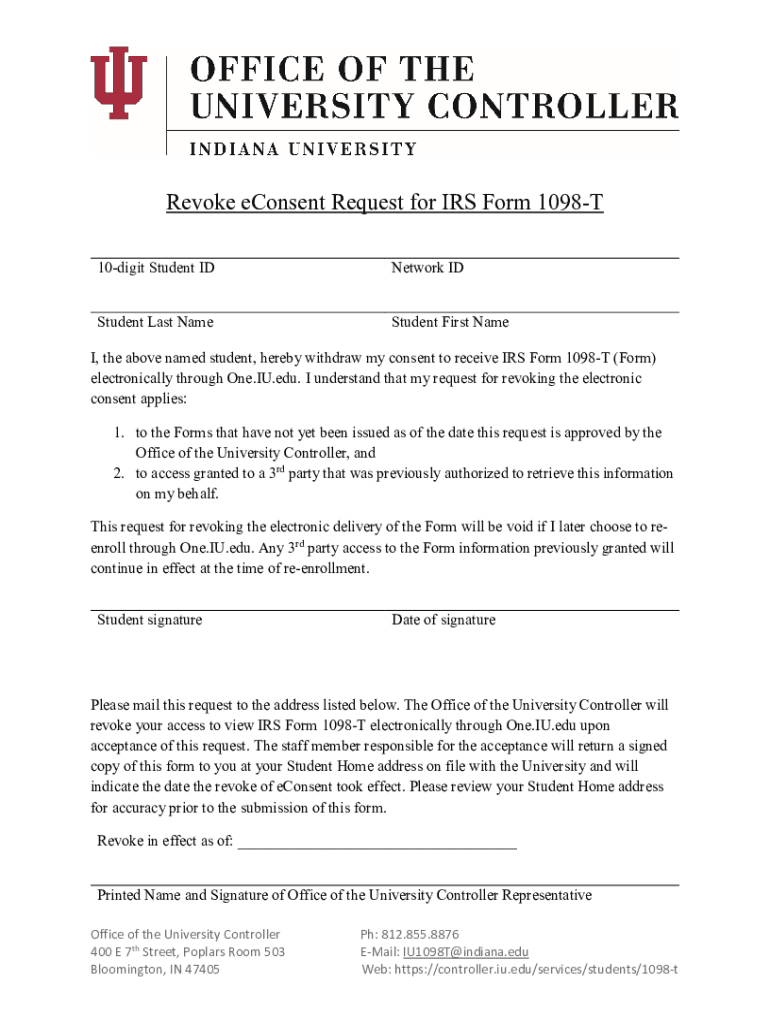 Revoke consent Request for IRS Form 1098T 10digit Student Network Student Last NameStudent First Name, the above named student, hereby withdraw my consent to receive IRS Form 1098T (Form) electronically