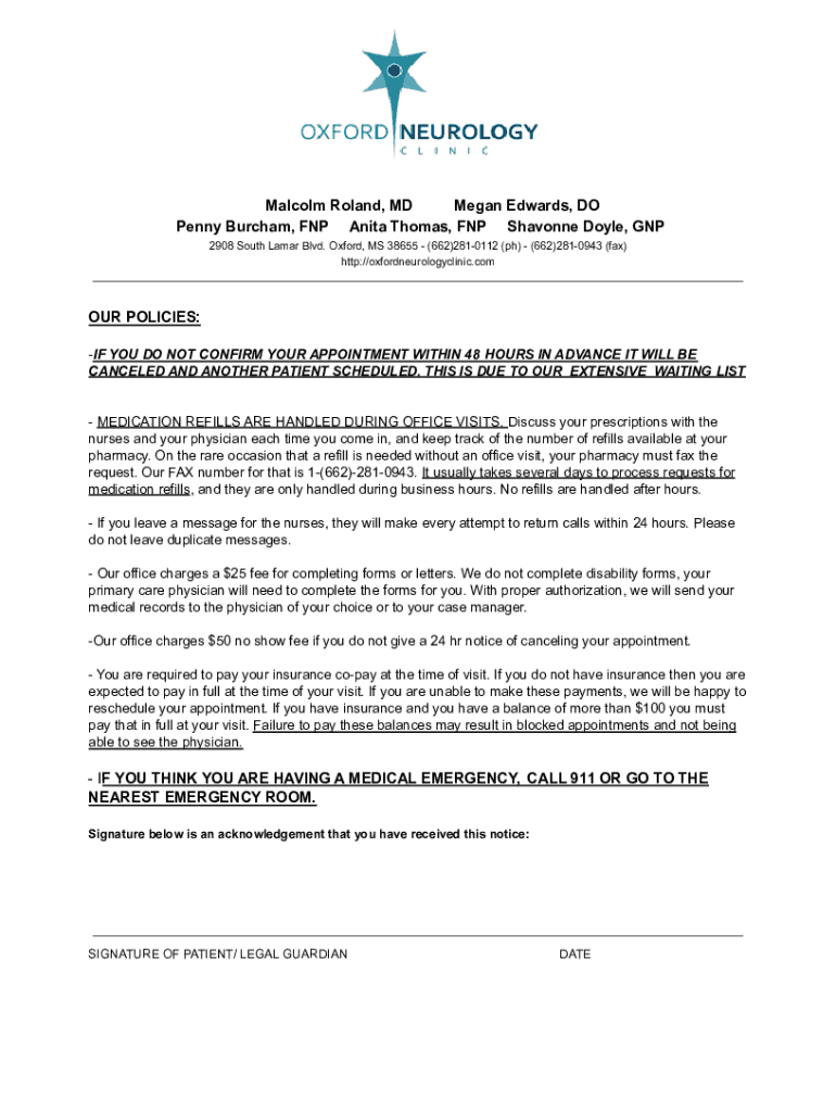 Malcolm Roland, MD Megan Edwards, DO Penny Burch am, FDP Anita Thomas, FDP Lavonne Doyle, GNP 2908 South Lamar Blvd. Oxford, MS 38655 (662)2810112 (pH) (662)2810943 (fax) http://oxfordneurologyclinic.comOUR