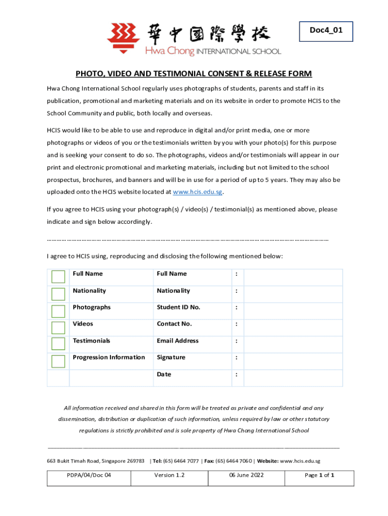 Doc4_01PHOTO, VIDEO AND TESTIMONIAL CONSENT & RELEASE FORM CWA Chong International School regularly uses photographs of students, parents and staff in its publication, promotional and marketing materials