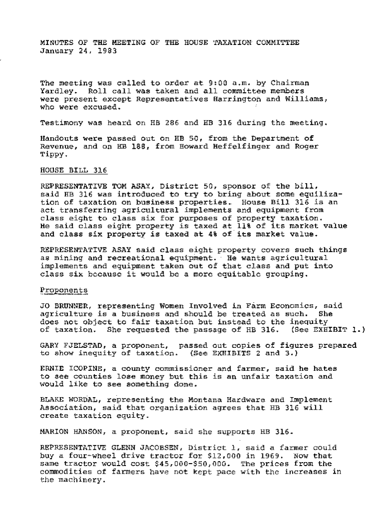 MINUTES OF THE MEETING OF THE HOUSE \'taxation\' COMMITTEE January 24, 1983The meeting was called to order at 9:00 a.m. by Chairman Yardley. Roll call was taken and all committee members were present