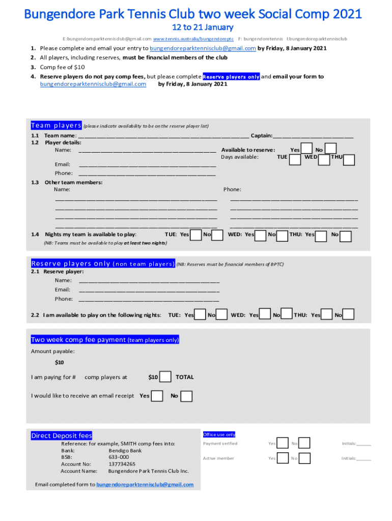 Bungendore Park Tennis Club two week Social Comp 2021 12 to 21 January E:bungendoreparktennisclub@gmail.com www.tennis.australia/bungendoreptc F: bungendoretennis I:bungendoreparktennisclub1. Please