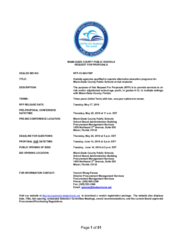 MIA MIDADE COUNTY PUBLIC SCHOOLS REQUEST FOR PROPOSALS SEALED BID NO:RFP15080YWPTITLE:Outside agencies qualified to operate alternative education programs for Miami-Dade County Public Schools at risk