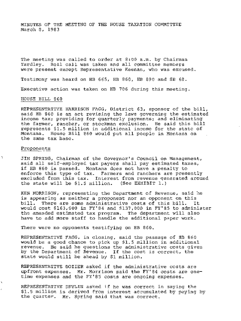 MINUTES OF THE MEETING OF THE HOUSE TAXATION COMMITTEE March 8, 1983The meeting was called to order at 8:00 a.m. by Chairman Yardley. Roll call was taken and all committee members were present except