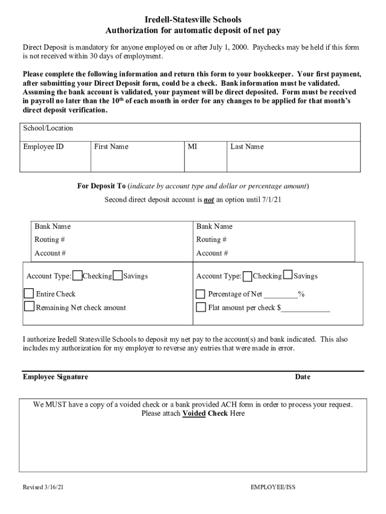 IredellStatesville Schools Authorization for automatic deposit of net pay Direct Deposit is mandatory for anyone employed on or after July 1, 2000. Paychecks may be held if this form is not received