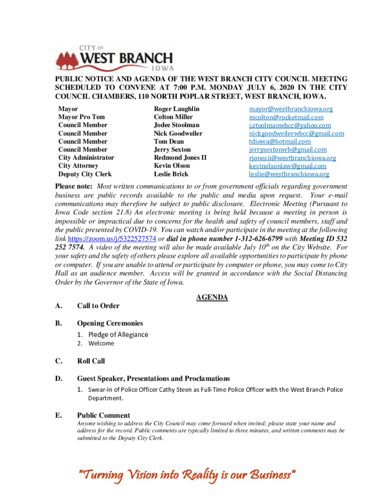 PUBLIC NOTICE AND AGENDA OF THE WEST BRANCH CITY COUNCIL MEETING SCHEDULED TO CONVENE AT 7:00 P.M. MONDAY, JULY 6, 2020, IN THE CITY COUNCIL CHAMBERS, 110 NORTH POPLAR STREET, WEST BRANCH, IOWA. Mayor