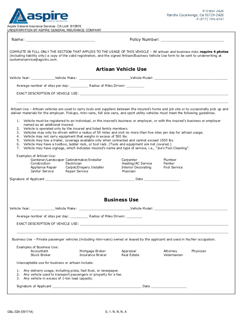 Aspire General Insurance Services CA LIC#: 0I10876 UNDERWRITTEN BY ASPIRE GENERAL INSURANCE COMPANYName: ___Policy Number: ___COMPLETE IN FULL ONLY THE SECTION THAT APPLIES TO THE USAGE OF THIS VEHICLE