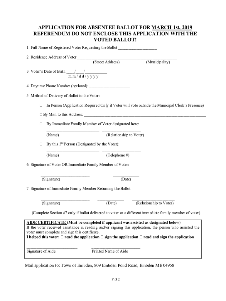 APPLICATION FOR ABSENTEE BALLOT FOR MARCH 1st, 2019 REFERENDUM DO NOT ENCLOSE THIS APPLICATION WITH THE VOTED BALLOT! 1. Full Name of Registered Voter Requesting the Ballot ___ 2. Residence Address