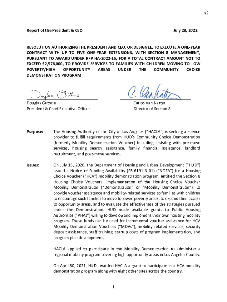 A2Report of the President & CEO July 28, 2022RESOLUTION AUTHORIZING THE PRESIDENT AND CEO, OR DESIGNEE, TO EXECUTE A NEYMAR CONTRACT WITH UP TO FIVE NEYMAR EXTENSIONS, WITH SECTION 8 MANAGEMENT, PURSUANT
