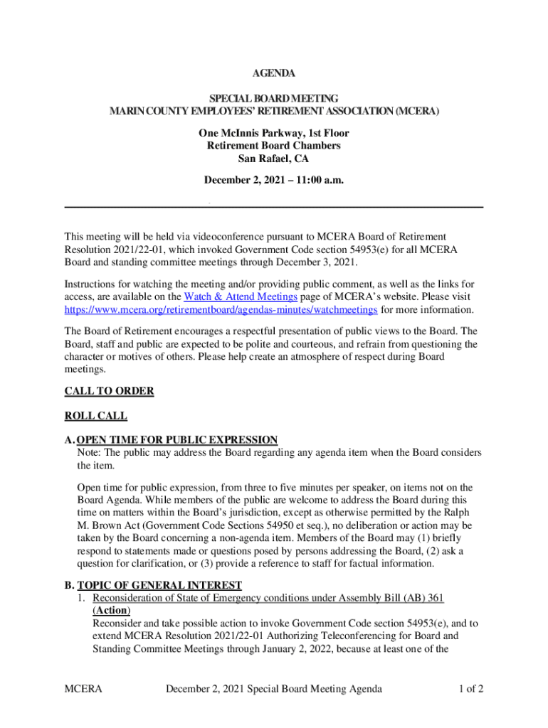 AGENDA SPECIAL BOARD MEETING MARIN COUNTY EMPLOYEES RETIREMENT ASSOCIATION (MC ERA) One McGinnis Parkway, 1st Floor Retirement Board Chambers San Rafael, CA December 2, 2021 11:00 a.m. This meeting