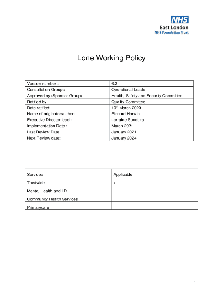 Lone Working PolicyVersion number :6.2Consultation GroupsOperational LeadsApproved by (Sponsor Group)Health, Safety and Security CommitteeRatified by:Quality Committeeman ratified:10th March 2020Name