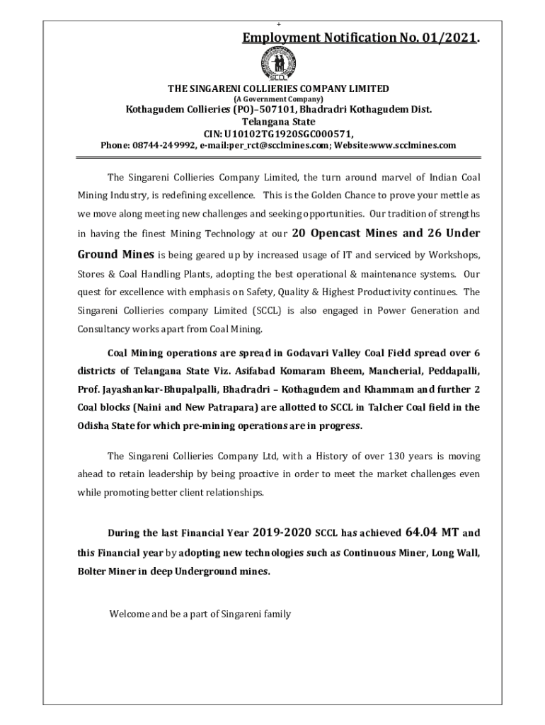 +Employment Notification No. 01/2021.THE SINGALONG COLLIERIES COMPANY LIMITED (A Government Company)Kothagudem Collieries (PO)507101, Bhandari Kothagudem Dist. Telangana State IN: U10102TG1920SGC000571,