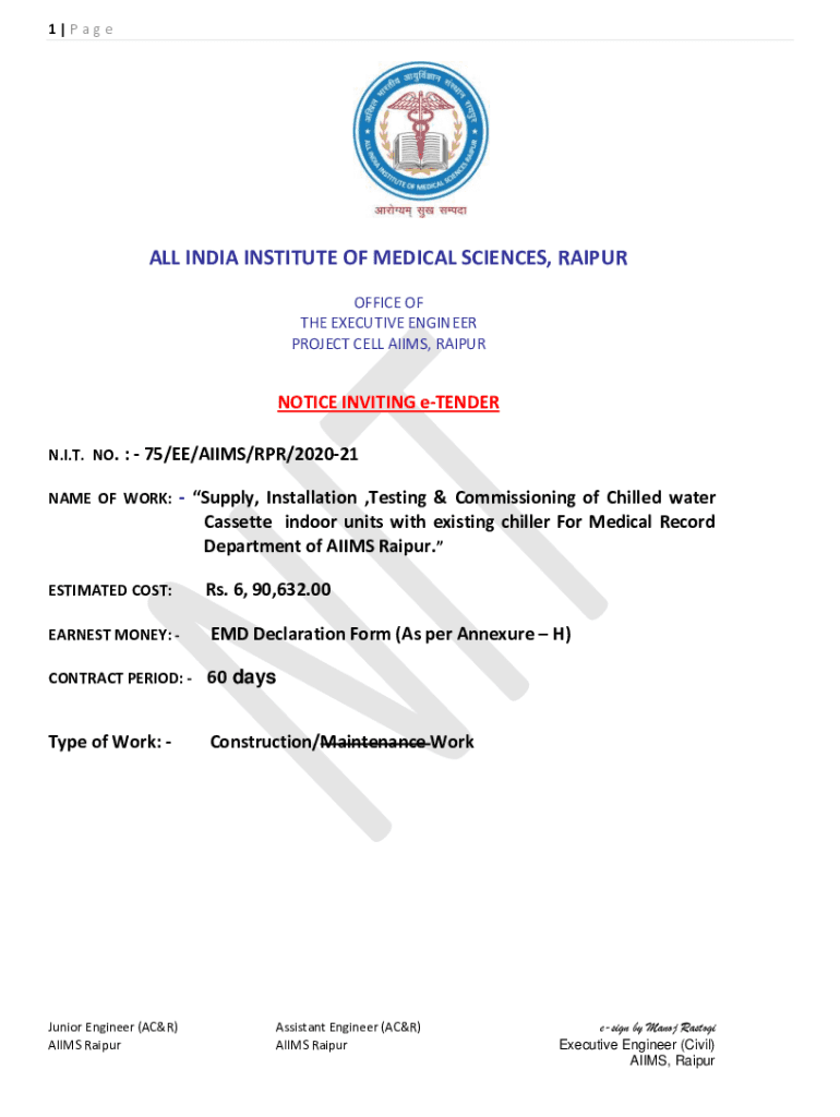 1|Page ALL INDIA INSTITUTE OF MEDICAL SCIENCES, RAIPUR OFFICE OF THE EXECUTIVE ENGINEER PROJECT CELL AIMS, RAIPURNOTICE INVITING tender N.I.T. NO. 75/EE/AIMS/RPR/202021 NAME OF WORK: Supply, Installation,