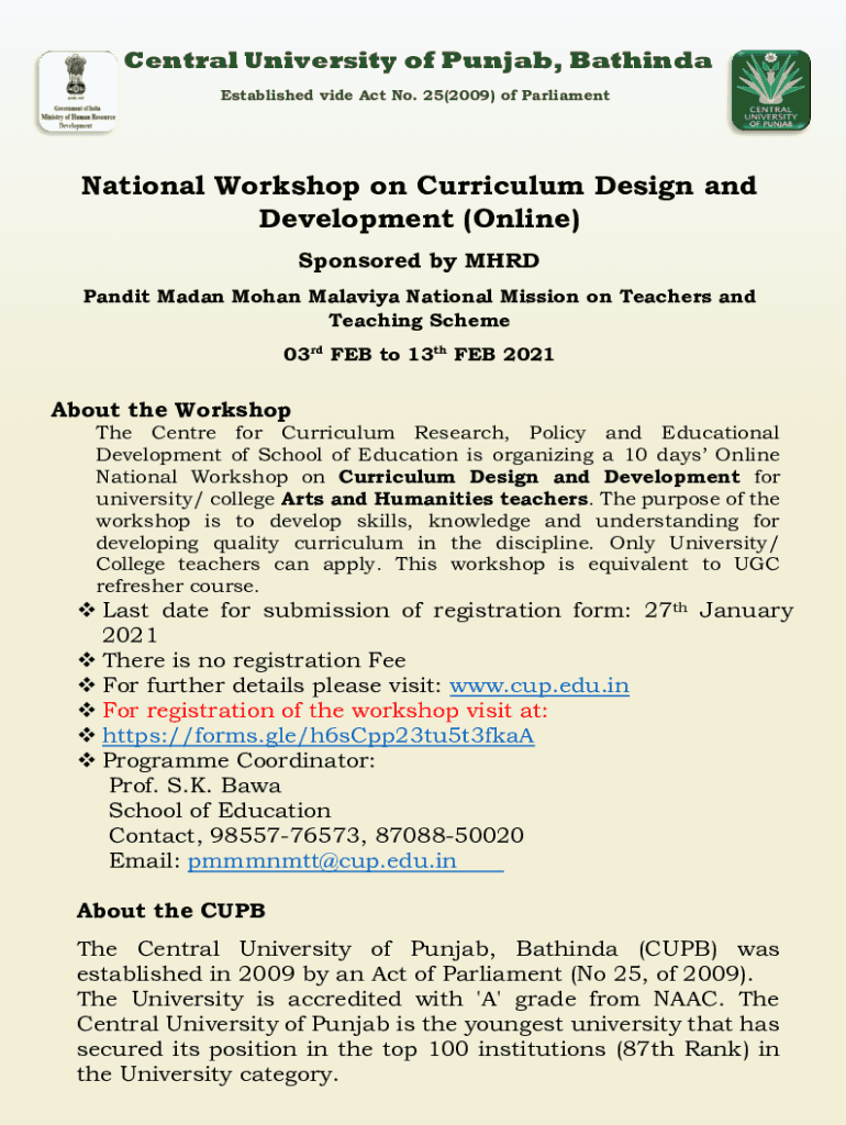 Get the free National Workshop on Curriculum Design and Development ... - cup edu