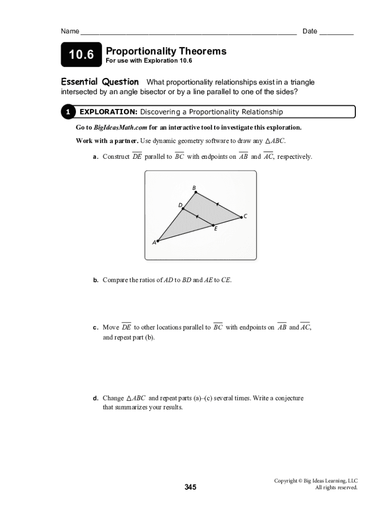 Name ___ Date ___Theorems 10.6 Proportionality For use with Exploration 10.6 Essential Question What proportionality relationships exist in a triangle intersected by an angle bisector or by a line