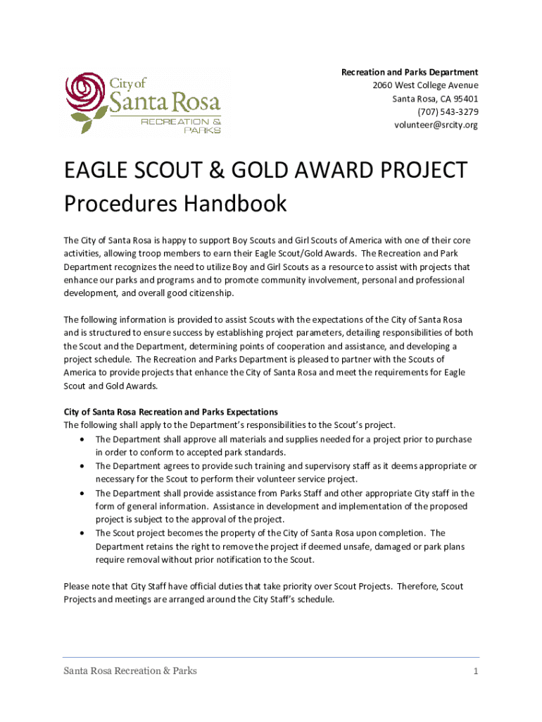Recreation and Parks Department 2060 West College Avenue Santa Rosa, CA 95401 (707) 5433279 volunteer@srcity.orgEAGLE SCOUT & GOLD AWARD PROJECT Procedures Handbook The City of Santa Rosa is happy