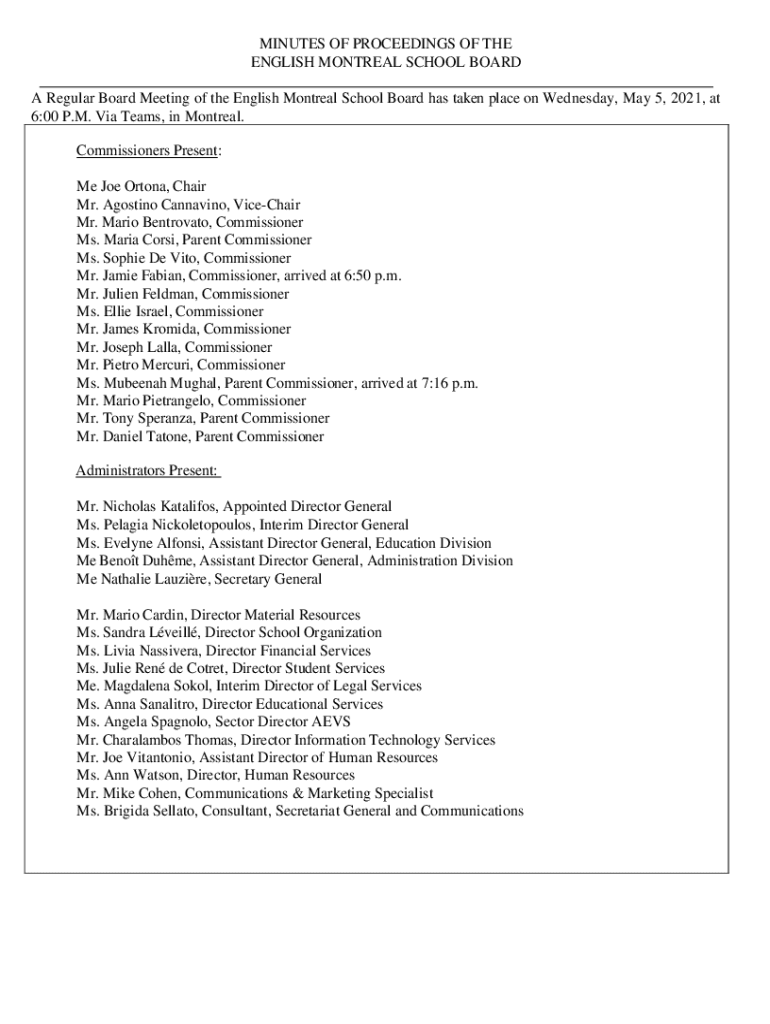 A Regular Board Meeting of the English Montreal School Board has taken place on Wednesday, May 5, 2021, at