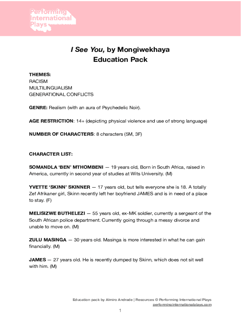 I See You, by Mongiwekhaya Education Pack THEMES: RACISM MULTILINGUALISM GENERATIONAL CONFLICTS GENRE: Realism (with an aura of Psychedelic Noir). AGE RESTRICTION: 14+ (depicting physical violence