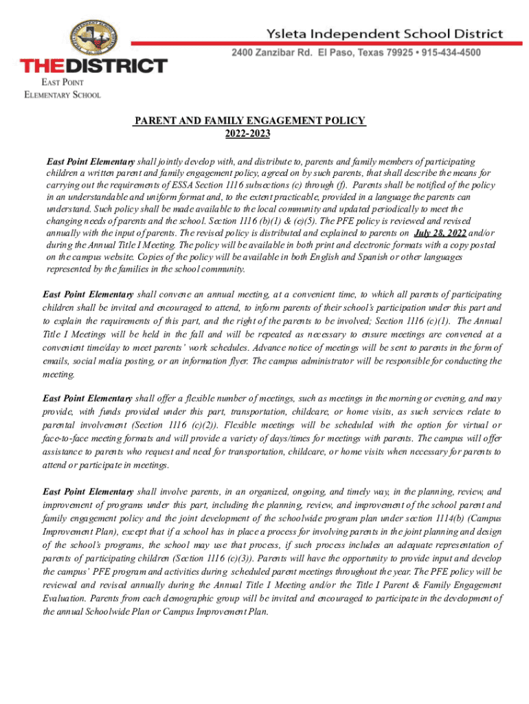 PARENT AND FAMILY ENGAGEMENT POLICY 20222023 East Point Elementary shall jointly develop with, and distribute to, parents and family members of participating children a written parent and family engagement