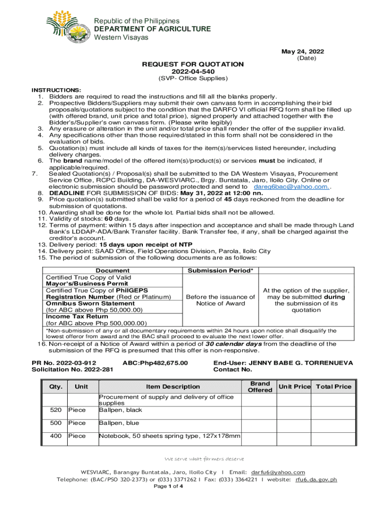 Republic of the Philippines DEPARTMENT OF AGRICULTURE Western Visayans May 24, 2022 (Date)REQUEST FOR QUOTATION 202204540 (SVP Office Supplies) INSTRUCTIONS:1. Bidders are required to read the instructions